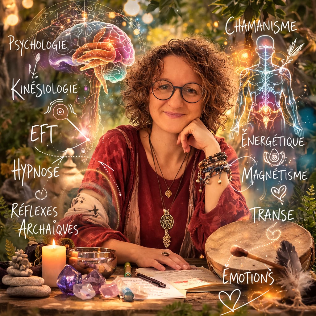 J’associe de manière naturelle la psychologie et la kinésiologie pour explorer les schémas profonds et libérer les blocages inscrits dans le corps. À cette approche, j’ajoute le soin énergétique et le magnétisme afin de restaurer l’équilibre intérieur et de soutenir la guérison. L’intégration des réflexes apporte une dimension corporelle essentielle, tandis que la dimension chamanique, riche de rituels de nettoyage des énergies, de récupération des parts d’âme et d’accompagnement des âmes vers d’autres mondes, permet de renouer avec la nature et les forces invisibles.